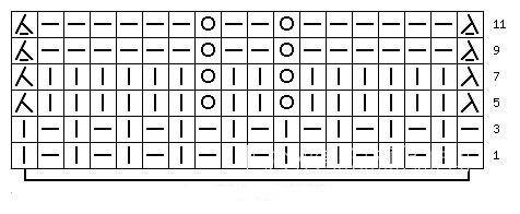The pattern consists of 18 stitches. Knit in front of the pattern. Repeat from the 1st to the 12th rows in height. Then, repeat from the 5th to the 12th rows. Finish with repeating the 1st to the 4th rows.