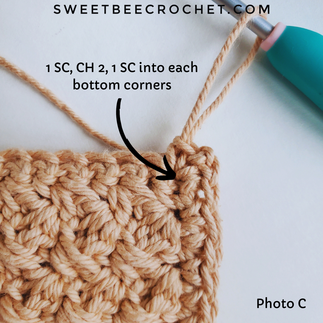 Place your panels on top of each other (bobble side out). Join yarn with a SS, CH 1 into the top left corner and evenly place 1 SC down the side, making sure to work through both panels. Place 1 SC, CH 2, 1 SC into the first bottom corner and continue placing 1 SC along the bottom edge. Place 1 SC, CH 2, 1 SC into the next bottom corner followed by 1 SC evenly along the last side of the bag. Fasten off and weave in all ends. See photos A, B, and C.
