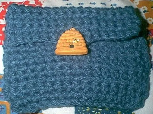 RND 19: Holding the piece in front of you, bring the left side over to the right side. Sew down the right side and around the bottom. With the flap positioned down, sew a button on RND 7, using the loop made with a chain 4. Weave in any ends.