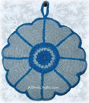 Next Row: 1 sc in each sc of petal decreasing 1 st in center of petal, ch 1, sl st between petals, ch 1, repeat from beginning all around, join, break thread. With Yellow, cover a bone ring with sc and sew to potholder.
