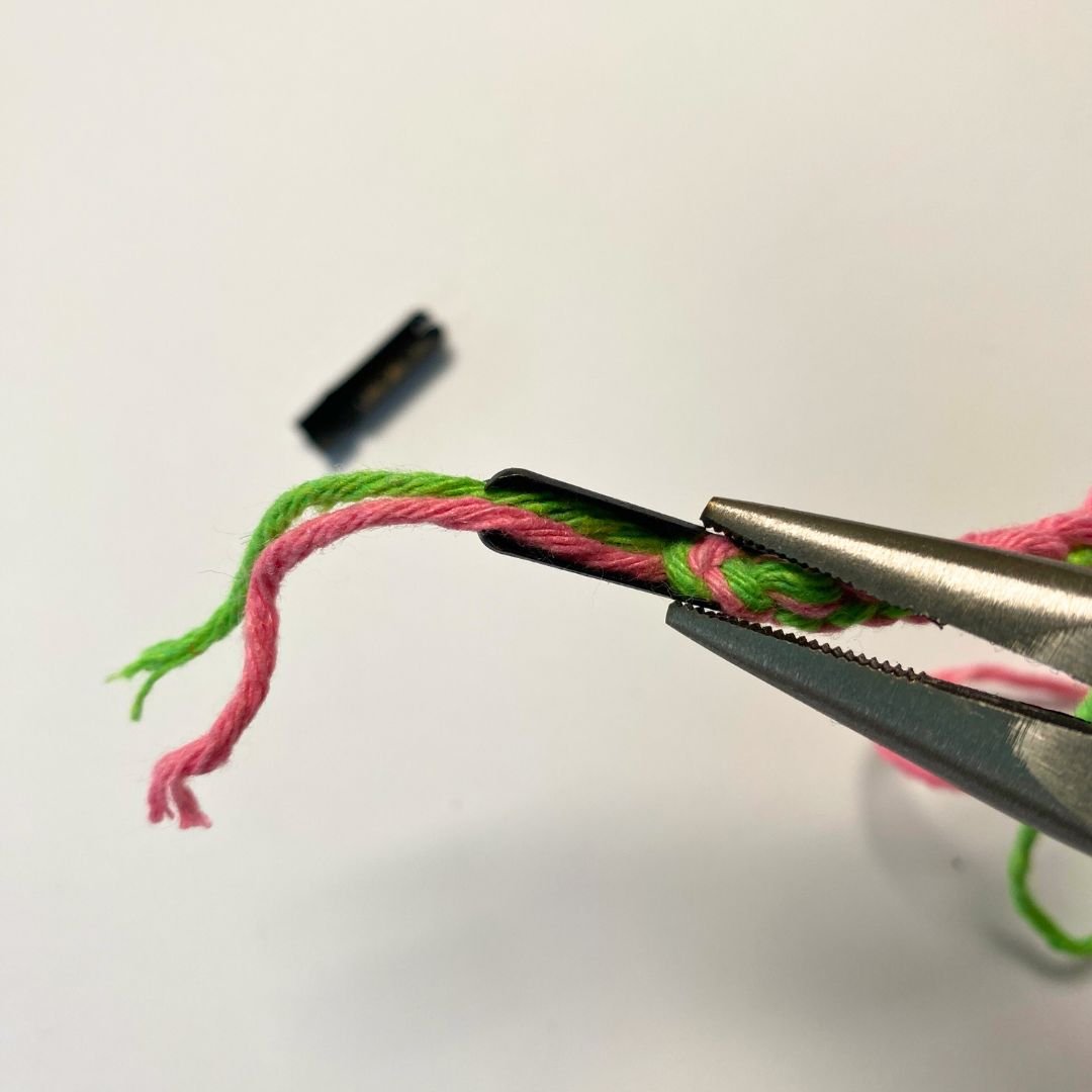 Once you've completed your cords, it's time to add the shoelace aglets. Using pliers, attach the aglets to each end of the cord. Snip off any excess yarn. And there you have it - a pair of handmade shoelaces that are unique and stylish!