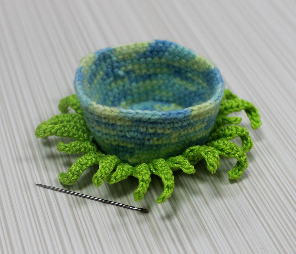 Attach the grass to the basket, sew the bottom edge to the 8th round and the leaves along the entire length.