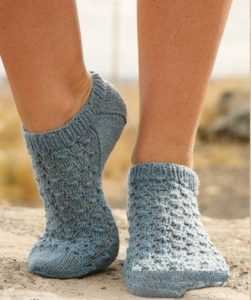 Stitches control: 26 sts and 34 rows = 10 x 10 cm. Relief socks are knitted in circle rows. Cast on 50 sts and circle them, knit the 1st row with knit sts. Then knit 2 cm with 1 x 1 rib. After that leave 21 st on the needles for the heel and the rest 29 sts should be placed on the auxilary needles for upper part.