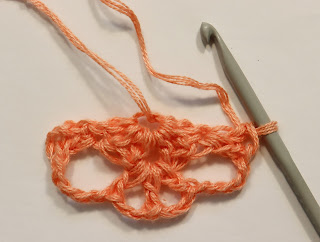 ch3 (counts as 1dc), turn, 1dc in first st., ch5, sk 2 sts, 1sc, ch5, sk 3 sts., 1sc, ch5, sk 3 sts., (1dc, ch2, 1dc, ch2, 1dc) in center ch1 sp, ch5, sk 3 sts., 1sc, ch5, sk 3 sts., 1sc, ch5, sk 2 sts., 2dc in last st. (in 3rd ch of turning ch3)