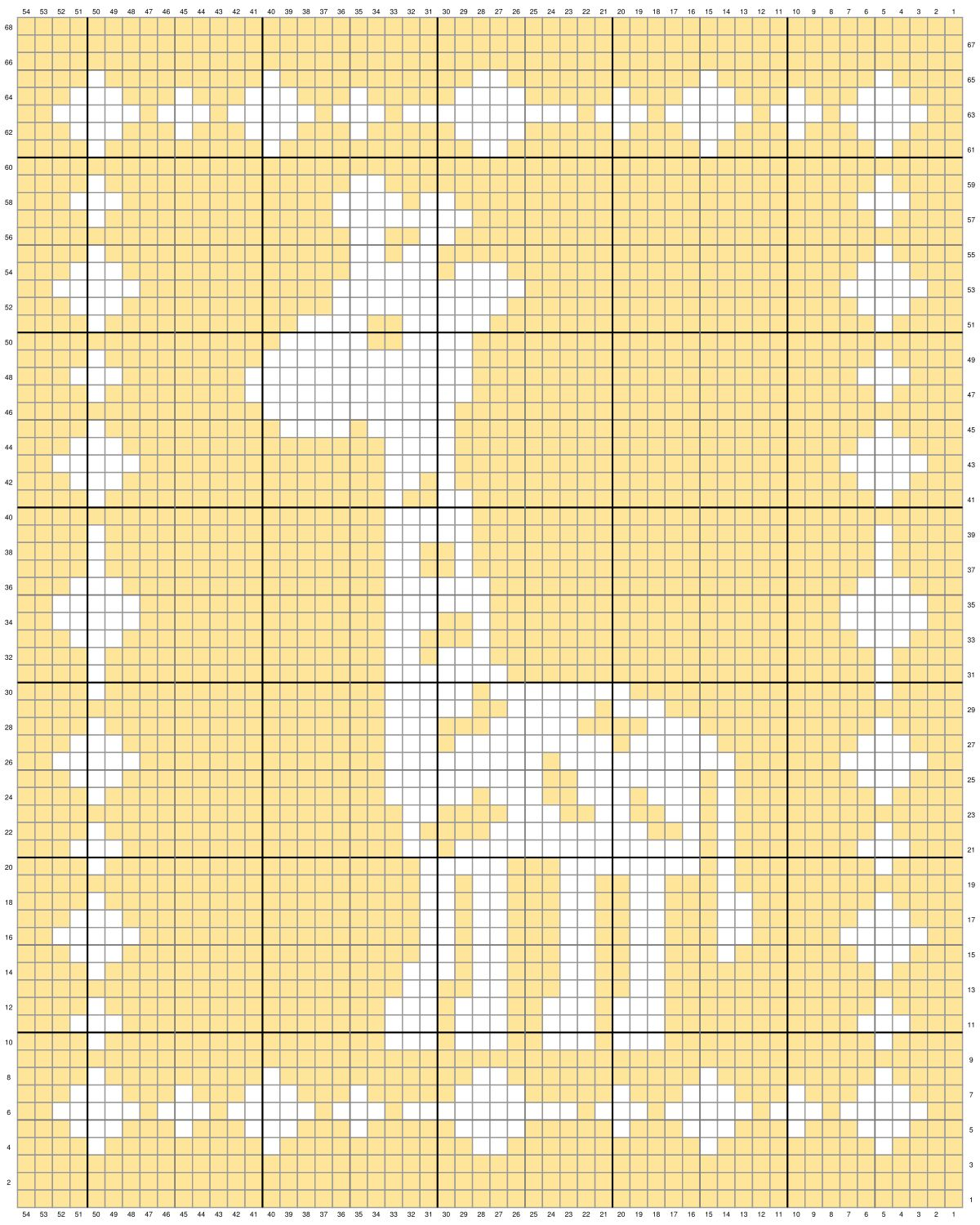 Row 61: Dc in the next 8 stitches. (Chain 1. Skip 1. Dc in the next 19 stitches.) x’s 2. Dc in the next 4 stitches. (Chain 1. Skip 1. Dc in the next stitches.) x’s 2. Dc in the next 22 stitches. Chain 1. Skip 1. Dc in the next 19 stitches. Chain 1. Skip 1. Dc in the next 9 stitches.
