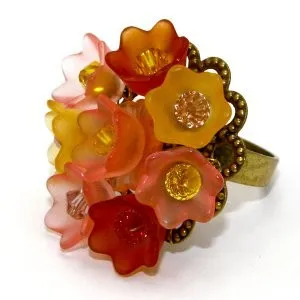 Thread a piece of wire (7 inches) through a crystal to the middle of the wire and bend together. Now pass this wire through your flower and then through the ring.