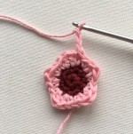 Round 4: *Ch 3, 2 dc in next dc, 2 dc in next dc, ch 3, sl st in sc, sl st in between sts on round 2 directly below, sl st in sc* repeat 5 times.