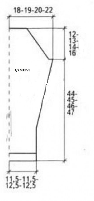 At 39 cm height, decrease 1.5 pattern repeats from both sides and continue work according to scheme 2. Match all the increases and decreases with the pattern design.