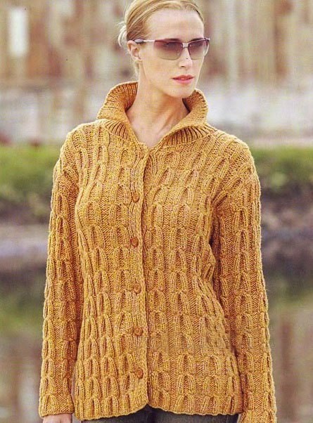 Cast on 60 sts and knit: 3 sts of placket, 5 sts of rib, the rest sts – arans. Foreseen 6 button-holes on the placket. Make decreases and increases for sides in the same way, as for back. At 42 cm bind off 6 sts for arm-hole and continue knitting straight. At 57 cm, transfer 8 sts to the auxiliary needle and bind off 6 sts, 4 sts, 3 sts, 2 sts, 1 st for neck-hole. At 61 cm, bind off 29 sts for shoulder.