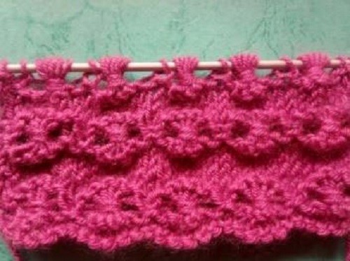 1 knit stitch, then repeat the following: * 5 knit stitches, each followed by 3 yarn overs, 1 knit stitch *; continue repeating from * to *.