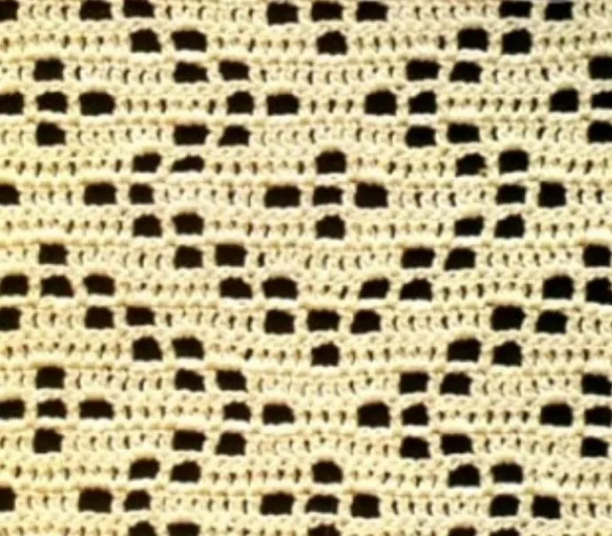 3 chain sts, * 3 double crochets, 2 chain sts, 1 double crochet, 2 chain sts, 4 double crochets, 2 chain sts, 1 double crochet, 2 chain sts, 7 double crochets, 2 chain sts, 1 double crochet, 2 chain sts, 1 double crochet, 2 chain sts, 4 double crochets *; repeat from * to * once, then add 3 double crochets.