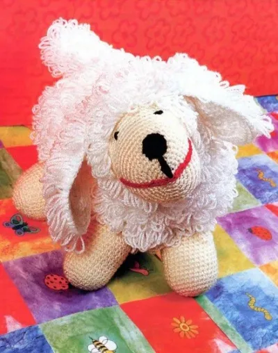 Make the nose due to the scheme 4 with black yarn and sew it to the head. Make eyes with black yarn and mouth with red yarn. Sew ears to the head, sew head to the body. Fill in the legs and tail with fiberfill and sew them to the body.