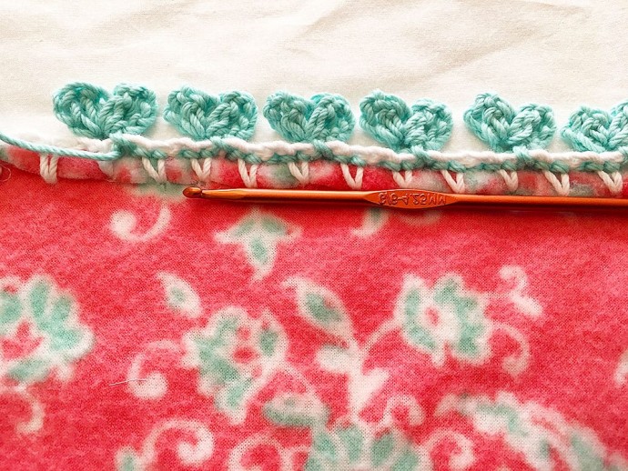 Make a foundation row or round on the prepared item. Crochet around the edge of the prepared item, giving enough ease (loosely enough) in stitches to lay flat and not pucker the cloth.