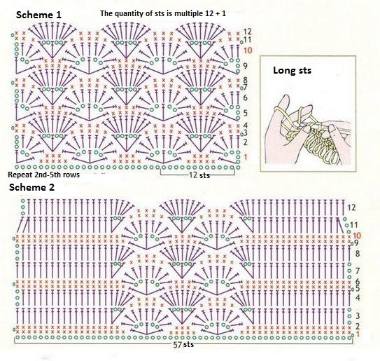 Make 61 chain stitches (13 stitches for every shoulder and 35 stitches for neck-hole) and work according to the scheme 1. At 22 cm height, which is the 3rd row of the scheme, make 6 chain stitches from both sides for arm-holes and continue work with the same pattern. At 72 cm height, cut the yarn.