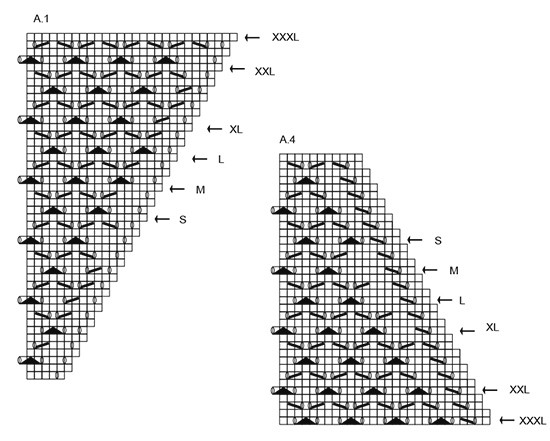 Start with the row marked with an arrow on the scheme (your size): * pattern A.4 (= 16-19-20-23-27-28 sts), pattern A.5 (= 22-20-22-20-20-22 sts), pattern A.6 (= 17-20-21-24-28-29 sts), cast on 14-14-20-22-26-30 new sts from both sides and make 2 rows of garter stitch, then knit the rest of the sts as previously.