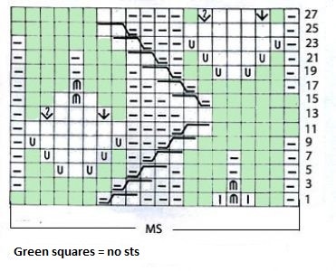 * 2 knit sts, 4 purls, 1 broaching, 3 knit sts, knit2tog, 1 purl*; repeat from * to *;