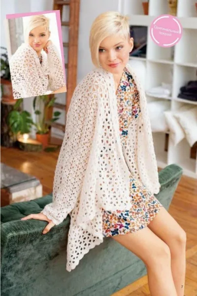 Fasten the upper and front edges of the jacket and lower edges of sleeves with 1 row of single crochets and shells. Make sleeve seams and sew them up. Sew the buttons to the left front.