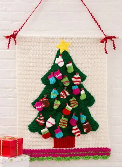 Wall hanging is made with a backdrop, tree, and ornaments. The backdrop is made in rows with a rod pocket for inserting a dowel or curtain rod. The tree and star are made separately and sewn to the wall hanging. The stocking and mitten ornaments are made separately with a loop to hang them from buttons.