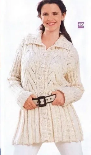 Make shoulder seams. Cast on 72 (76) 80 sts along the neck-hole for collar with circular knitting needles and work with rib between selvage sts, start and finish with 2 purls. At 14 cm height of the collar, bind off the sts according to the pattern. Sew up the sleeves. Make all the seams. Sew buttons.