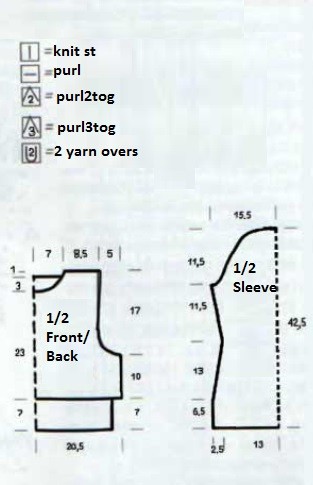 Cast on 40 sts with pink yarn and make 7 cm of rib, increase 3 sts in the last row = 43 sts. Then, work with the relief pattern. In 10 cm = 16 rows from rib, bind off 2 sts from both sides for arm-holes and 1 x 2 sts and 1 x 1 st in every 2nd row = 33 sts. In 26 cm = 40 rows from rib, bind off the central 15 sts for neck-hole and finish both sides separately. In 27 cm = 42 rows from rib, bind off the rest 9 sts of shoulder from each side.