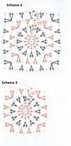 Make an initial stitch with orange yarn and work in circle rows according to scheme 2. Make 1st-4th rows once.