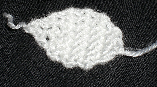 Sc two remaining stitches together. Tie off yarn. You should have a petal-shaped piece as shown below.