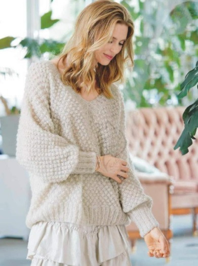 Make shoulder seams. For trim, cast on 139 sts along neck-hole with circular knitting needles and work with rib in circle rows, divide the sts in the center of front neck-hole to make 1 knit st in the center and 2 purls from both sides of this st. For better shaping, make the central 3 sts together of front neck-hole in every circle row as follows: knit the central st with the previous st as knit2tog, 1 knit st, draw it through the slipped sts. Bind off all the sts according to the pattern along a 10 cm width of trim. Sew up the sleeves, make side and sleeve seams.