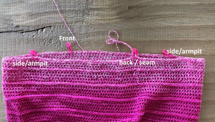 Finish off and re-attach yarn at the stitch marker under the armpit. We’re going to work in rows from the armpit to the front & back.