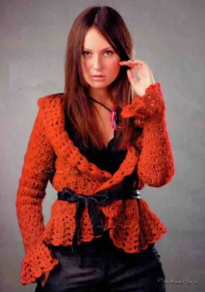 Make as one-piece detail, starting from back. Make 83 chain sts with woolen yarn and work due to the scheme 1. At 13 cm height, leave 6 sts from both sides for arm-holes = 71 sts and crochet straight. In 26 cm from the beginning of arm-hole, leave the central 24 sts unfinished for neck-hole. For this, divide 71 sts in half 12 sts from right and left sides of center and continue making both halves of front separately, decrease 1 st in every row from inwards for neck-hole chamfer in order to have only 6 sts left. At the same time, in 14 cm from the beginning of neck-hole, increase 1 st in every row. At 6 cm height, you should get 12 sts for each half of front. Cut the yarn.
