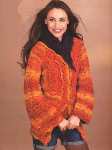 Fasten the edges of front and neck-hole with 4 rows of shells pattern, make 6 pattern repeats from front edges and 5 pattern repeats along neck-hole. Fasten the edges of sleeves with 4 rows of shells pattern. Sew buttons.