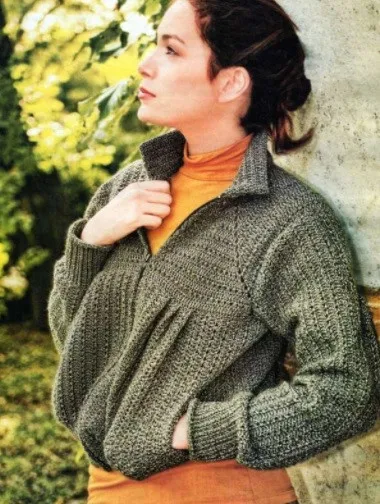 Sew yoke to back and front. Sew up the sleeves in the arm-holes. Make side and sleeve seams. Fasten the lower edge, including sleeves with 2 rows of single crochets. Sew zipper.