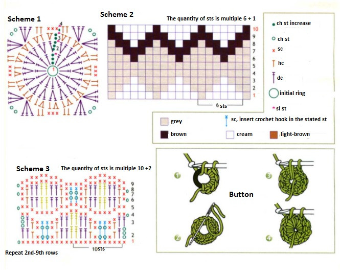 Make 4 motifs according to scheme 1, alternating the colors of yarn in the following order: initial ring and 1st row with fancy yarn, 2nd row – with light-brown yarn, 3rd row – grey yarn, 4th row – brown yarn. Connect motifs (see pattern design). Lift 62 sts along the upper edge with brown yarn and make 2 rows of single crochets with brown yarn, followed by 2 rows with grey yarn and 2 rows with brown yarn. Continue work with jacquard pattern according to scheme 2 for 10 rows, decreasing 1 st in the 1st row = 61 sts. Then, make 2 rows of single crochets with grey yarn, followed by 2 rows with brown yarn. Continue work with fancy pattern according to scheme 3 using grey yarn, increasing 1 st in the 1st row = 62 sts, alternating the colors of yarn in the 4th and 8th rows in the following way: fancy yarn, brown yarn, light-brown yarn. Continue crocheting all the rows with grey yarn. At 46 cm height, bind off 2 sts from both sides for the armhole and decrease 3 x 1 st in every row = 52 sts. At 66 cm height, after getting 12 sts for each shoulder and 28 sts for the neck-hole, finish your work.