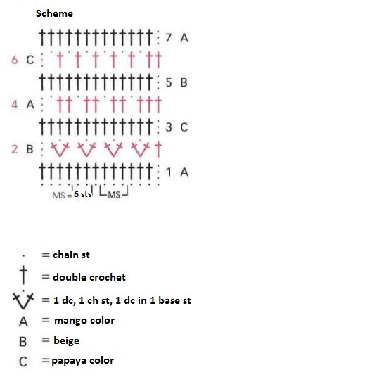 Main pattern: the quantity of sts is multiple 6 + 2. Work due to the scheme. Start with sts before pattern repeat, pattern repeat, finish with sts after pattern repeat. Make 1st-7th rows x once, then, repeat 2nd-7th rows due to the colors order.