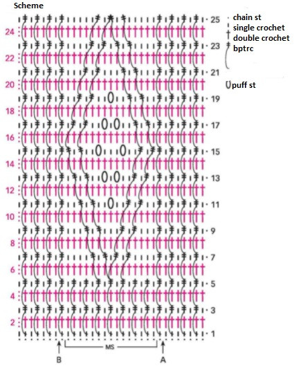 Main pattern: the quantity of sts is multiple 15 + 1. Work according to the scheme. Start with sts before pattern repeat (= rib), pattern repeat (rhombs pattern), and finish with sts after pattern repeat (= rib). Make 1st-5th rows x once, repeat 2nd-5th rows x once, and repeat 6th-25th rows.