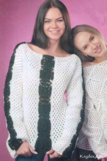 Make 84 chain stitches with white yarn and crochet 5 rows of half crochets. Then, proceed according to Scheme 2. At 34 cm, increase 5 x 1 pattern repeat on each side for sleeves, followed by 1 x 26 pattern repeats. Crochet for 11 cm, leaving 4 x 9 pattern repeats unfinished on both sides. There should be 13 pattern repeats remaining for the neck-hole.
