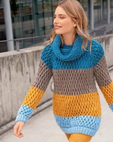 Make raglan seams. For trim, cast on 48 (52) 56 sts along the neck-hole with blue-green yarn and work with 1 x 1 rib with circular rows. Bind off all sts when the width of the trim is 4 cm. Make side and sleeve seams.