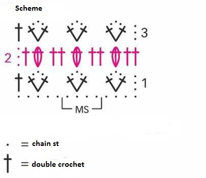 The quantity of sts is multiple 4 + 1. Work due to the scheme. Start with sts before pattern repeat, pattern repeat, finish with sts after pattern repeat. Make 1st-3rd rows once, then, repeat 2nd-3rd rows.