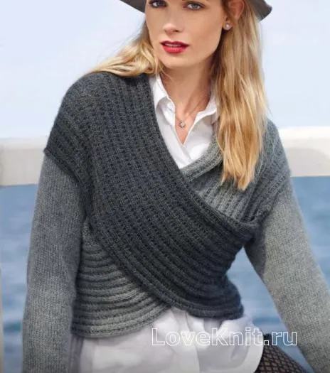 The front and back consist of one long stripe, where the color of the yarn is changed. Starting from the back, the stripe twists around the upper part of the body, crossing the front and turning to the back.