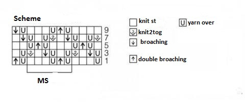 6 sts wide. Work according to the scheme, which states only RS rows, and make WS rows and yarn overs as purls. Start with sts before pattern repeat, follow the pattern repeat, and finish with sts after pattern repeat. Complete rows 1st-10th and then repeat rows 3rd-10th.