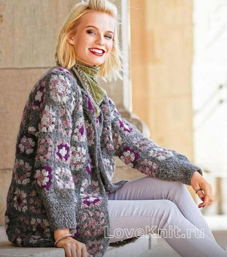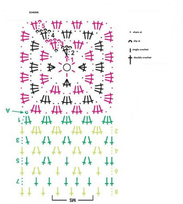 For plackets, fasten the lower edges of sleeves with grey yarn; for this, join the yarn at the outer corner of a square with 1 slip st at arrow A and continue work according to the scheme of the pattern. Make 1st-8th rows once, then repeat 7th-8th rows.