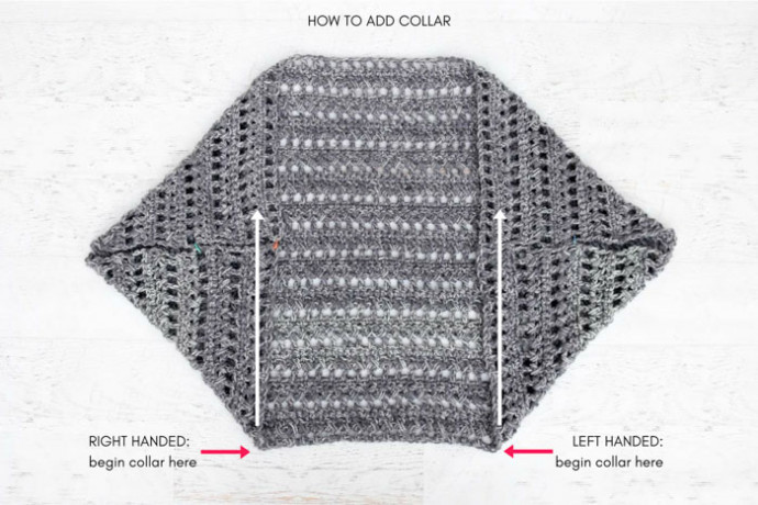 Turn your new shrug-lette right side out and lay it flat as pictured in photo below. Place a stitch marker in the double crochet stitch that falls at the intersection of the bottom of the shrug and the perpendicular collar edge. Repeat on second side.