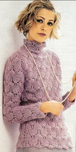 Make 49 chain sts and work with fancy pattern due to the scheme 1. At 8 cm height, increase 14 x 1 st in every 2nd row due to the scheme 3. At 37 cm height from the beginning of work, decrease 4 x 3 sts, 7 x 2 sts and 9 x 1 st in every row from both sides for sleeve caps. At 59 cm height, finish your work.