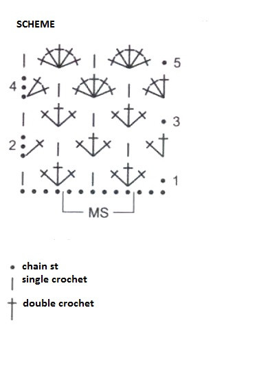 On 6 sts of set-up row: work due to the scheme with yellow yarn. Turn the rows due to the scheme. Start with sts before pattern repeat, pattern repeat, finish with sts after pattern repeat. Make 1st-5th rows x once, then, repeat 2nd-5th rows.
