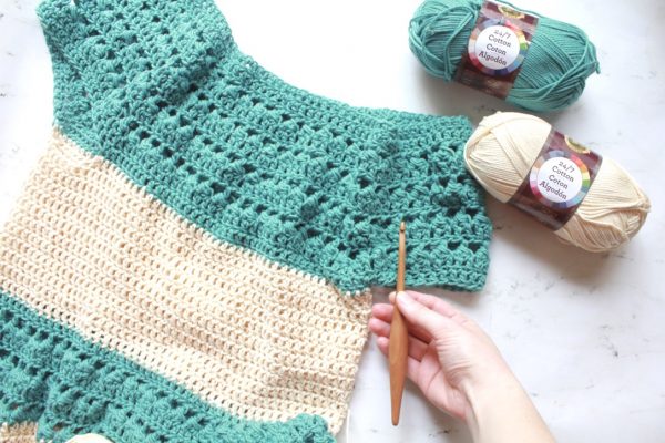 - Rnd 14 (14, 18, 20, 22, 25, 27): dc in each dc around including the ch 6s you made in the armholes, join with sl st to ch 2 at beginning of round [88, 96, 116, 128, 136, 152, 164]