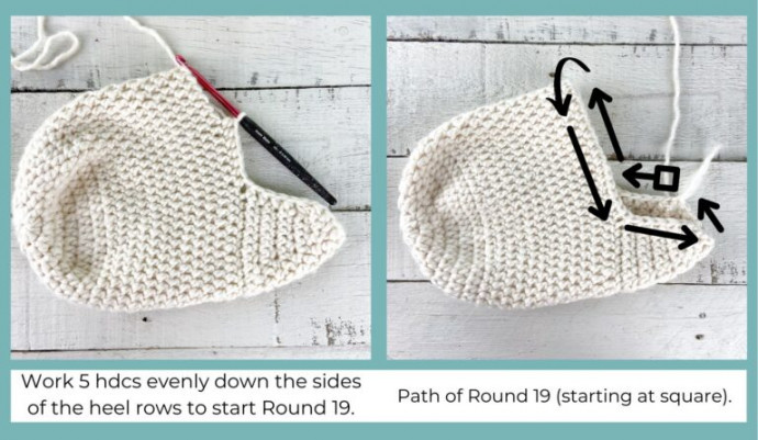 Tilt work so that you are working back up the other side of the heel. Evenly space 5 hdc along the row ends.