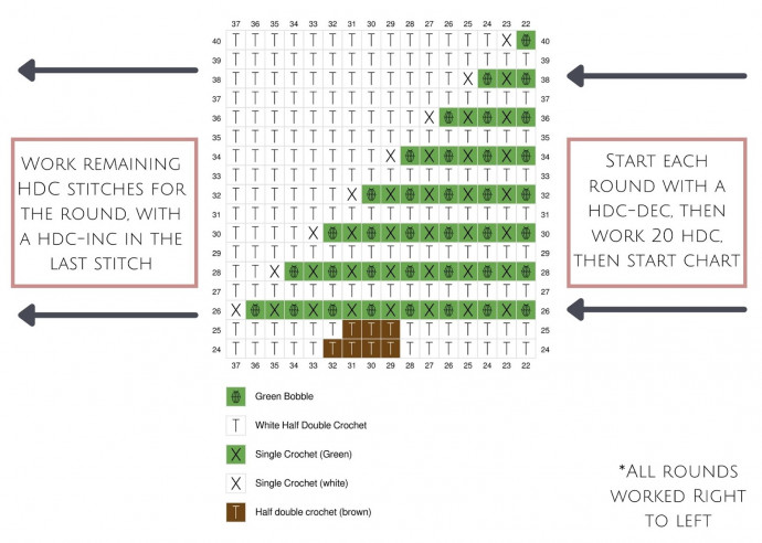 Round 34: Hdc-dec over the first 2 sts, 1 hdc in the next 20 sts (switch to green), work [bo in the next st, sc in next] 4 times (on the 4th bobble, pull through with white and work the last sc with white), 1 hdc in the next 19 sts, hdc-inc in the last st. Sl st to join. Ch 1, DO NOT TURN. <50 sts>