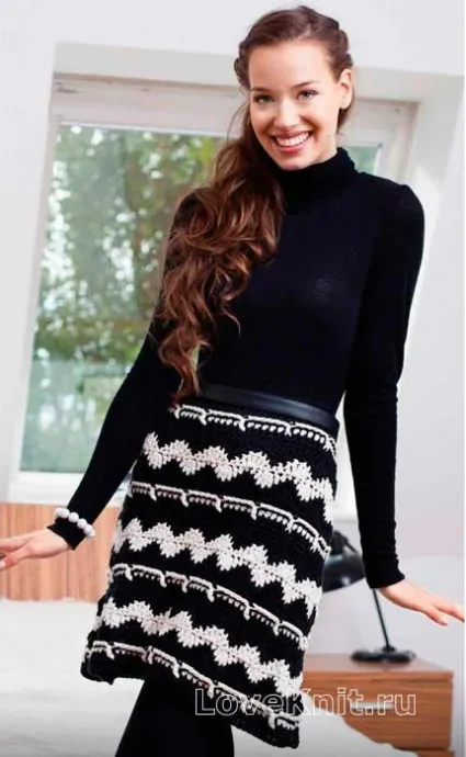Make 67 (73) chain sts + 3 chain sts increase with black yarn and work with the main pattern. At the same time, skip 2 x 1 cm in every 4th row and 11 x 1 cm in every 2nd row from both sides for side chamfers. In 44 cm = 34 rows from the set-up row, finish your work. Make pattern design in full dimensions and make decreases, matching with it.