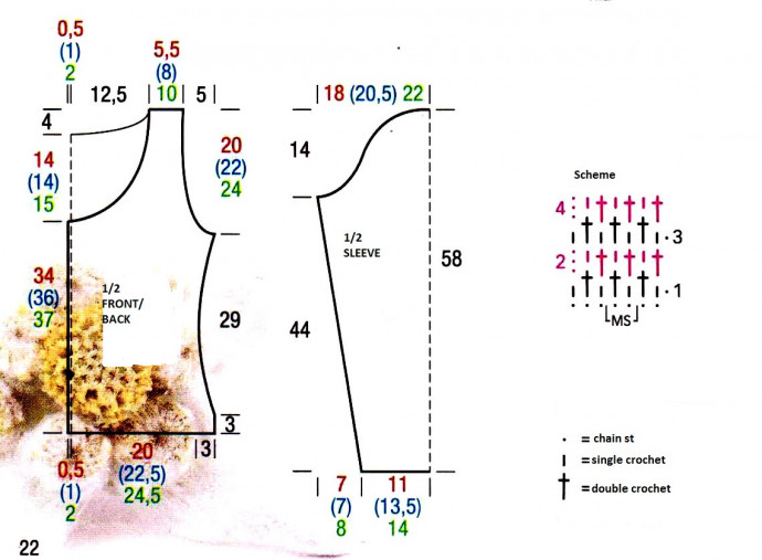 Make 31 (37) 39 chain sts + 1 chain st increase and work with the main pattern. For chamfers, increase 10 x 1 st in every 6th row from both sides (10 x 1 st in every 6th row) 3 x 1 st in every 6th row and work due to the pattern 8 x 1 st in every 4th and 6th row = 51 (57) 61 sts. In 44 cm from the set-up row, bind off 3 sts from both sides for sleeve caps and 1 x 2 sts in the next row, 8 x 1 st in every 2nd row and 1 x 2 sts, 1 x 3 sts in every row. Finish your work on the rest 15 (21) 25 sts in 58 cm from the set-up row.