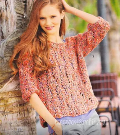 Relief pattern: the quantity of sts is multiple 10 + 1 + 2 selvage sts. Work according to the scheme, on which only RS rows are stated, make WS rows as sts face, and make yarn overs as purls. Start with 1 selvage st and sts before pattern repeat, pattern repeat, finish with sts after pattern repeat and 1 selvage st. Repeat 1st-16th rows.