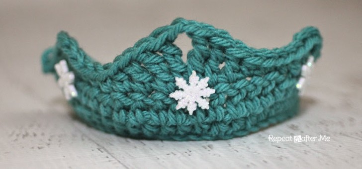To make an even larger Tiara/Crown, add 12 chains to starting chain and make an additional crown hump to either side of the crown. A single crown hump pattern is as follows: SC in first 3, HDC, DC + chain 2 + DC, HDC. One crown hump is equal to 6 stitches… one hump on each side equals an additional 12 stitches.